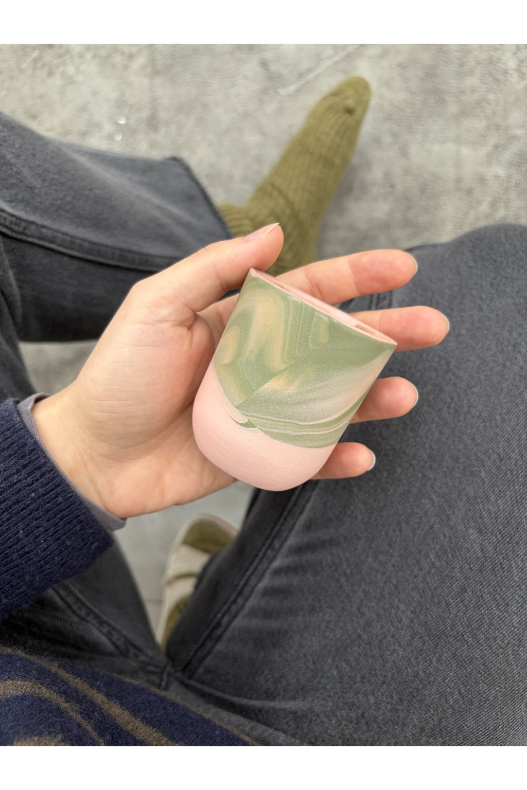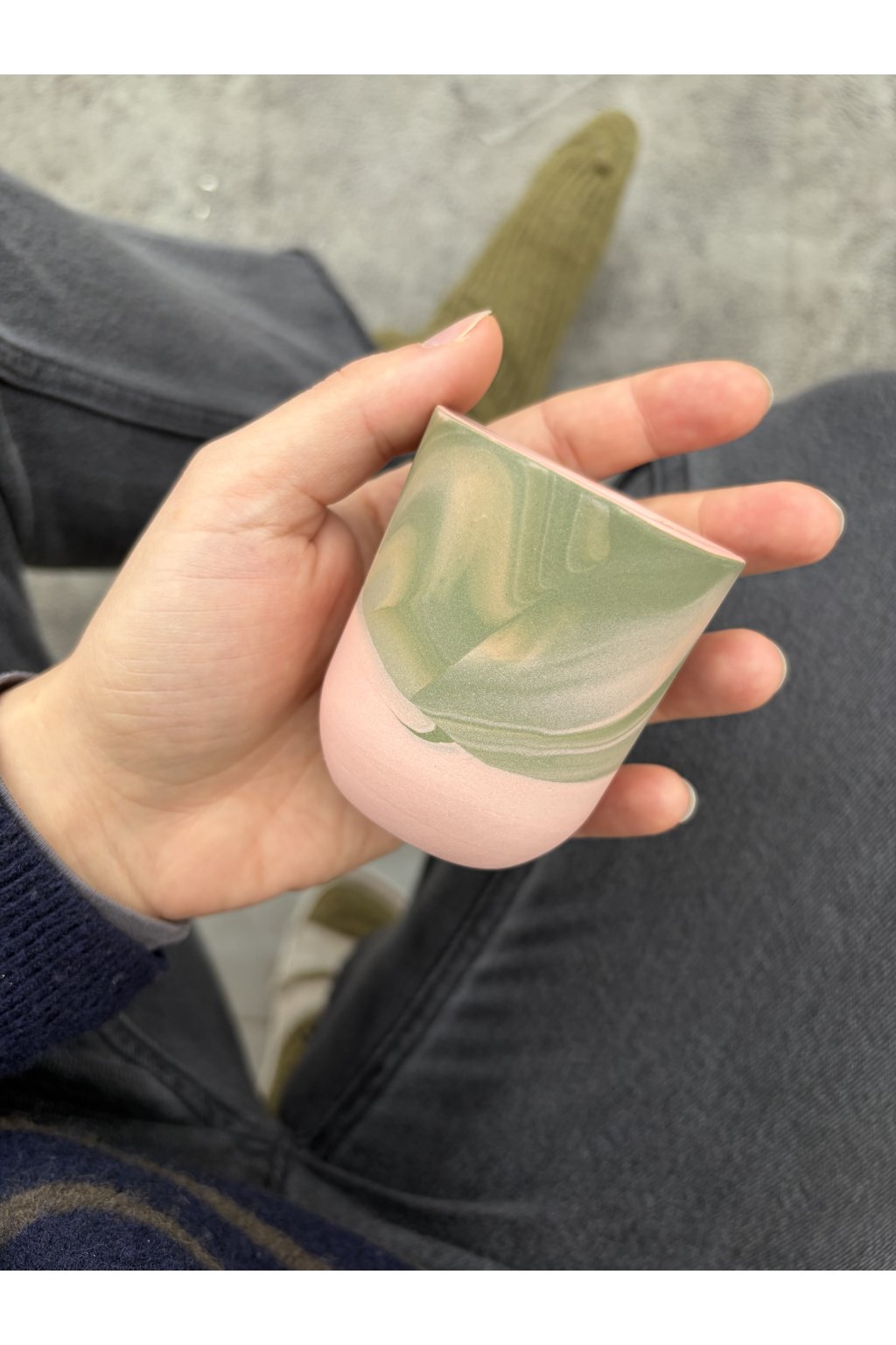 Kalíšek z barevného mramorovaného porcelánu. Dekor se může lišit, ale kalíšky se sobě podobají. Mramorování je uvnitř i venku. Kalíšek je glazovaný pouze uvnitř, lesklou transparentní glazurou.