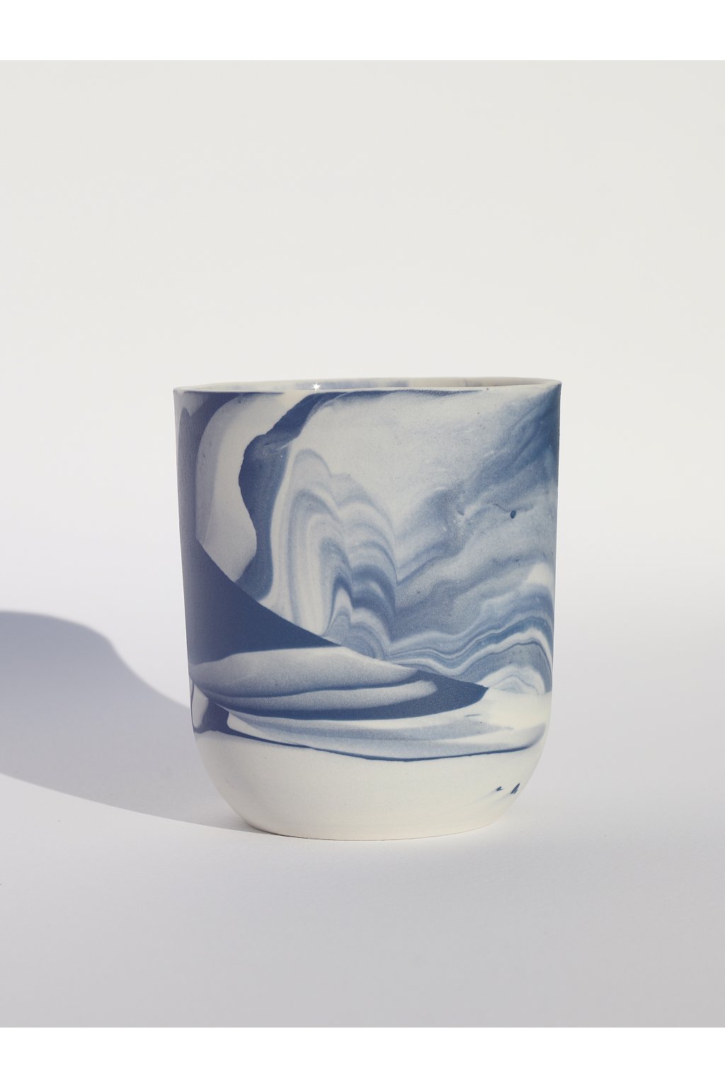 Kalíšek z barevného mramorovaného porcelánu. Dekor se může lišit, ale kalíšky se sobě podobají. Mramorování je uvnitř i venku. Kalíšek je glazovaný pouze uvnitř, lesklou transparentní glazurou.