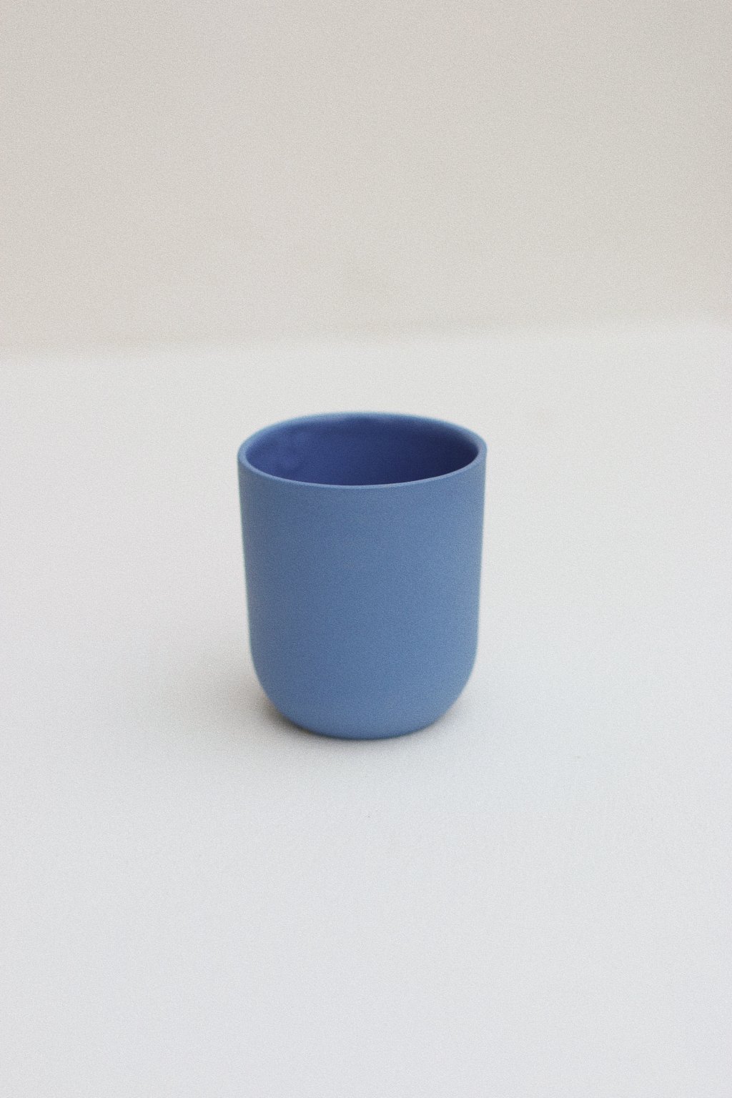 Odlévaný kalíšek z barevného porcelánu. Zvenku matný, uvnitř glazovaný lesklou transparentní glazurou.