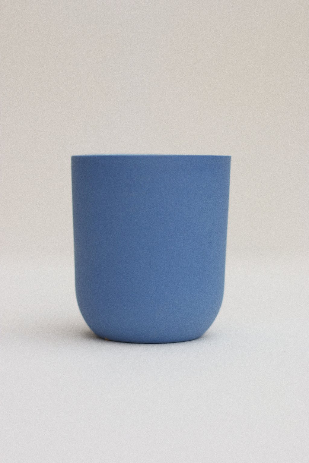 Odlévaný kalíšek z barevného porcelánu. Zvenku matný, uvnitř glazovaný lesklou transparentní glazurou.
