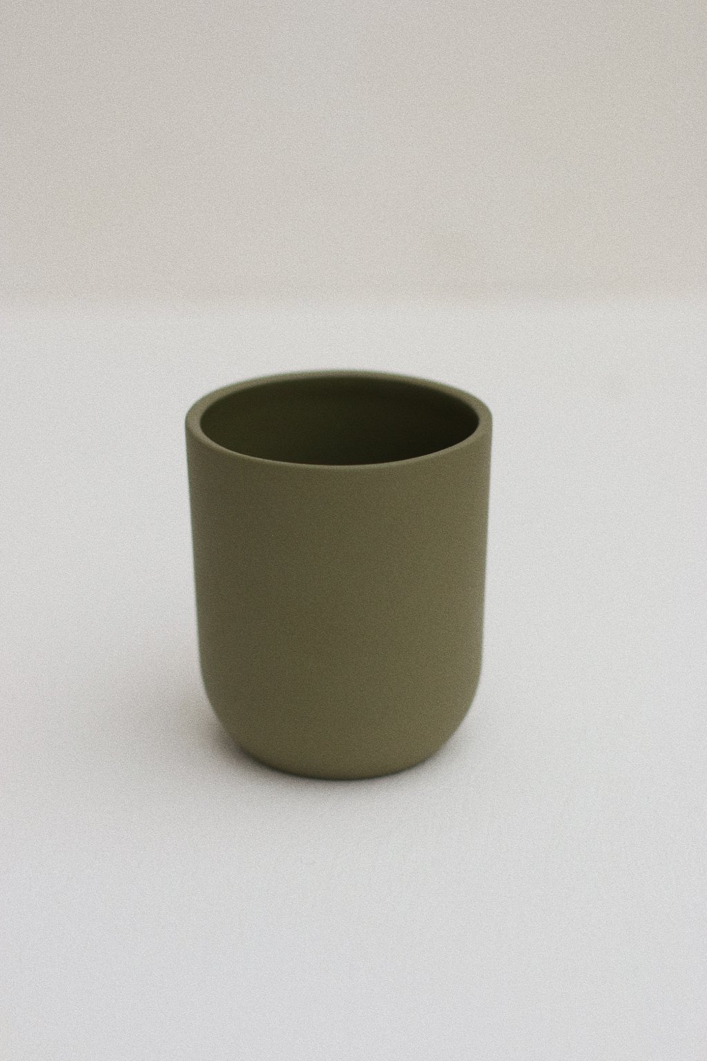 Odlévaný kalíšek z barevného porcelánu. Zvenku matný, uvnitř glazovaný lesklou transparentní glazurou.