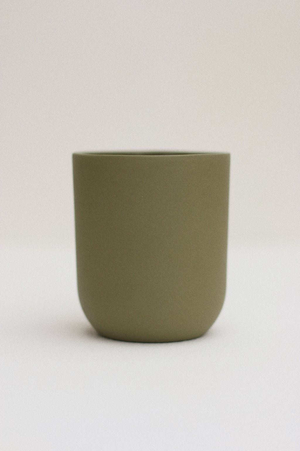 Odlévaný kalíšek z barevného porcelánu. Zvenku matný, uvnitř glazovaný lesklou transparentní glazurou.