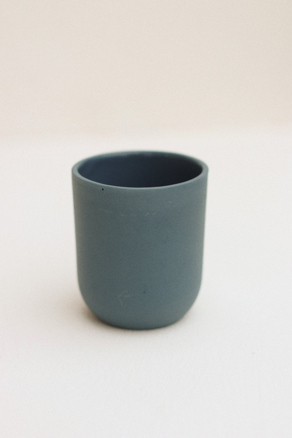 Odlévaný kalíšek z barevného porcelánu. Zvenku matný, uvnitř glazovaný lesklou transparentní glazurou.